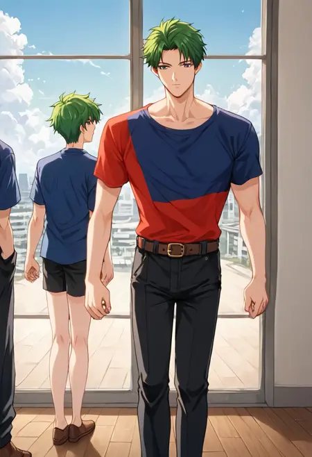 빨간 티셔츠, (파란 재킷, 짧은 소매), 검은 바지, 벨트, 갈색 신발,