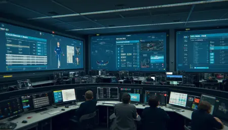 이는 비디오 게임이나 과학 소설 영화에서나 볼 법한 고기술 미래형 컨트롤 패널의 사진입니다. 패널은 붉은색과 검은색으로 구성된 큰 육각형 중앙 디스플레이로 지배되며, 다양한 디지털 표시와 지시등이 있습니다. 육각형 주변에는 작고 직사각형의 화면과 버튼들이 있으며, "SPREAD"과 "HOLD"라는 흰색 텍스트가 빨간 배경 위에 표시되어 있습니다. 인터페이스는 매끄럽고 금속 질감을 지니며, 빛나는 조명 디자인을 갖추고 있습니다.