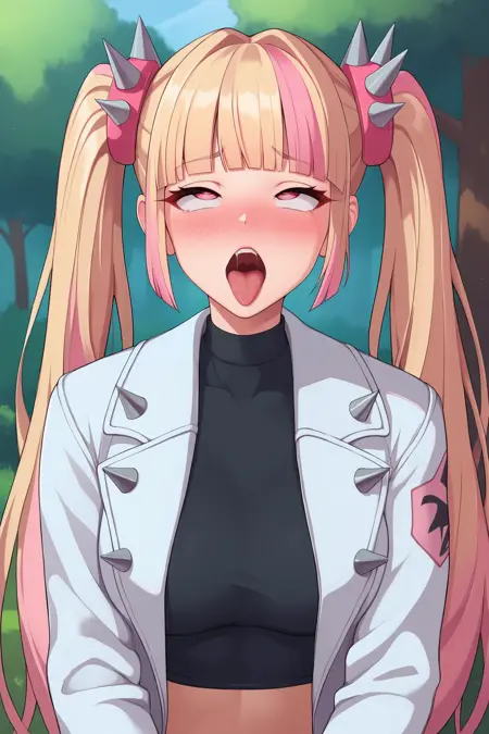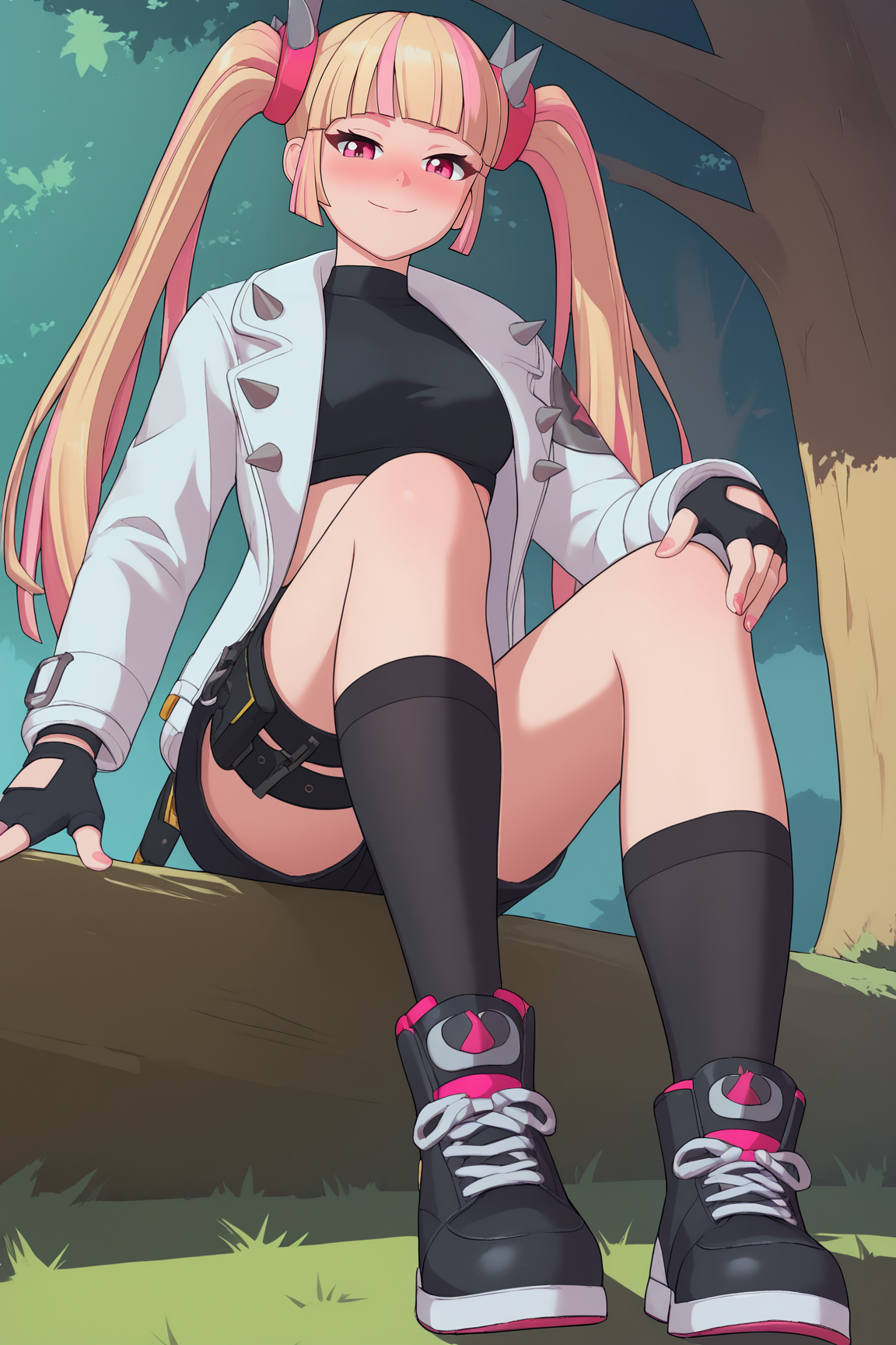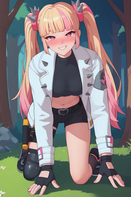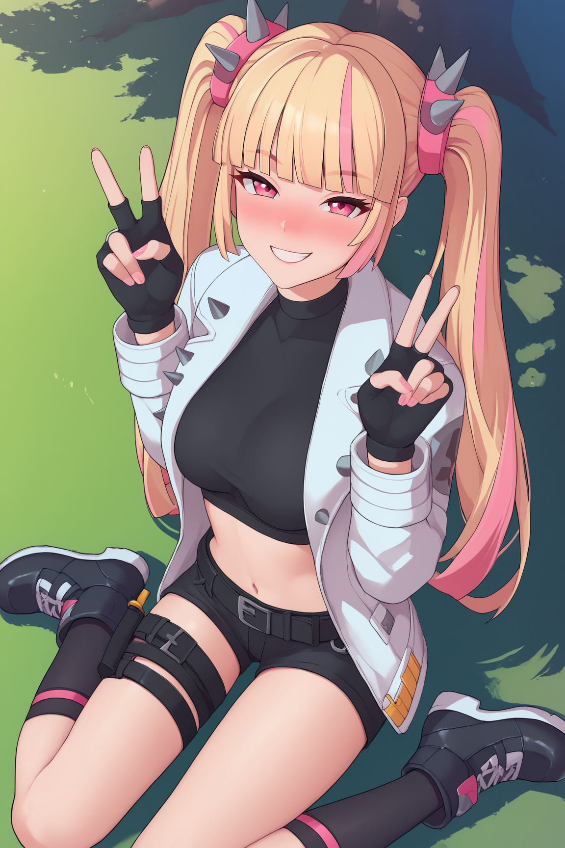 ➜ LennoxRoseFOPXL, 粉色眼睛, 金色头发, 粉色头发, 多色头发, 长双马尾, 侧发, 齐刘海, 发梢尖刺, 粉色发饰, 中等胸部, 白色夹克, 长袖, 开襟夹克, 黑色腰部, 黑色手套, 无指手套, 黑色腰带, 黑色短裤, 大腿绑带, 黑色护膝, 黑色袜子, 黑色鞋子