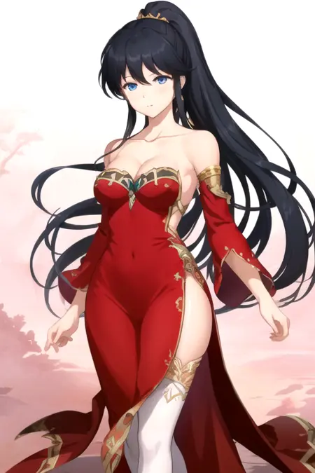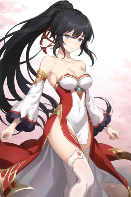 JessicaLangrisser, 1girl, solo, very long hair, blue eyes, medium breasts, black hair, white thighhighs, long sleeves, red dress, cleavage, bare shoulders, collarbone, high ponytail, detached sleeves, side slit, long dress