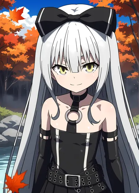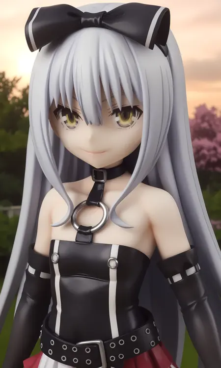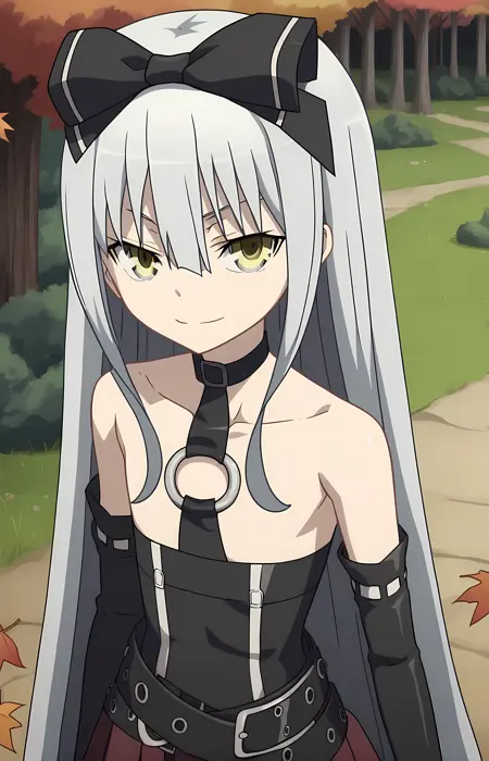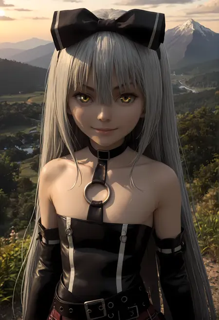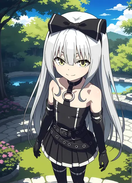 Outfit → bare_shoulders, choker, bow, hair_bow, collar, ribbon, dress, skirt, black_bow, belt, black_dress, hair_ribbon, pantyhose, cosplay, gloves, elbow_gloves, black_pantyhose, hairband, thighhighs, shoes, necktie, pleated_skirt, o-ring, gothic_lolita,