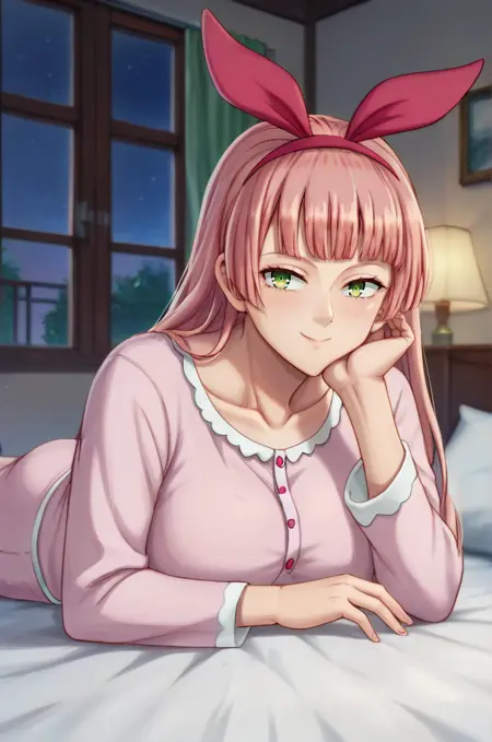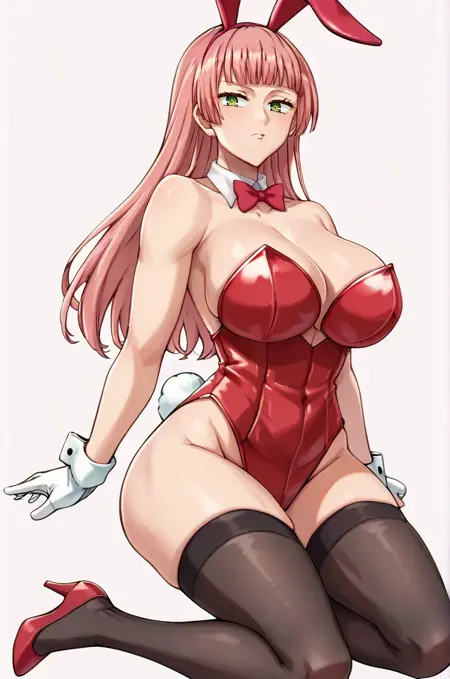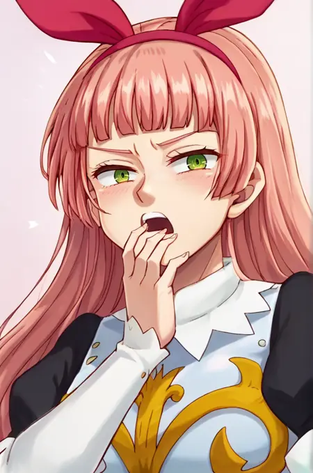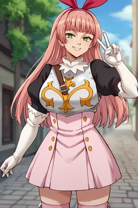 isolde, 분홍색 머리, 녹색 눈, 곧은 앞머리, 긴 머리, 검은 눈, 큰 가슴, 빨간 헤어밴드, 분홍색 드레스, 검은 퍼프 소매, 분홍색 허벅지 스타킹, 흰색 팔꿈치 장갑, 갑옷, 가슴 보호대, 분홍색 신발,
