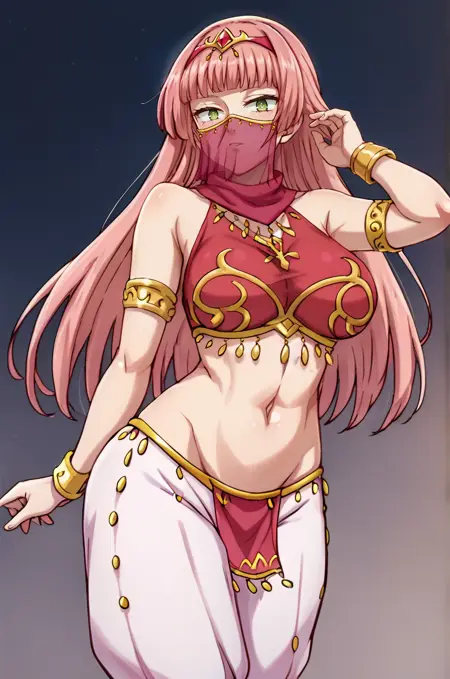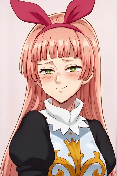 isolde, pink hair, green eyes, blunt bangs, long hair, black eyes, large breasts, red hairband, pink dress, black puffy sleeves, pink thigh-highs, white elbow gloves, armor, breastplate, pink footwear,