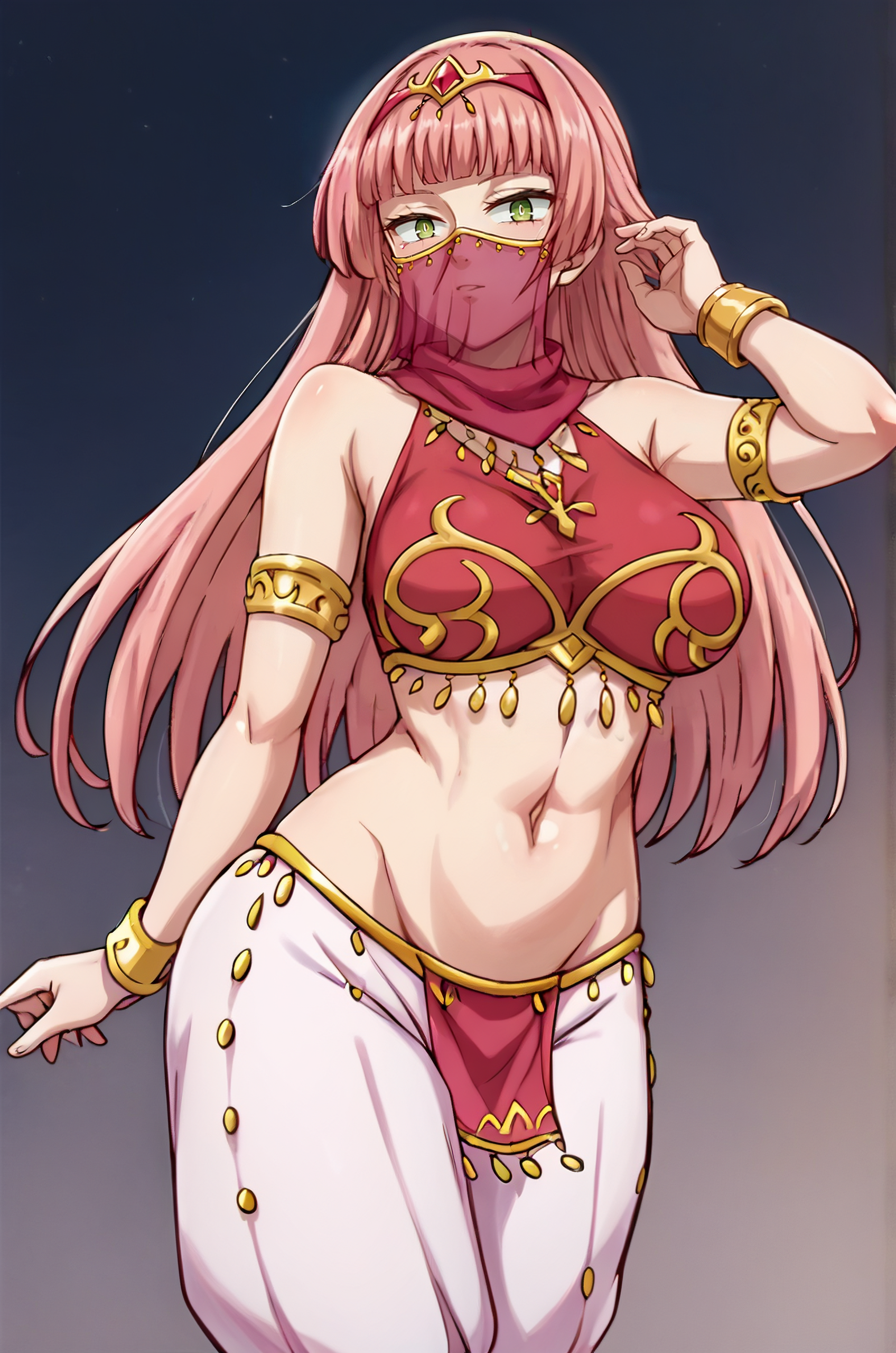 isolde1, 분홍색 머리, 녹색 눈, 곧은 앞머리, 긴 머리, 검은 눈, 큰 가슴, 빨간 헤어밴드, 파란색 드레스, 짧은 소매, 가슴 노출, 갈색 벨트, 분홍색 허벅지 스타킹, 장갑,