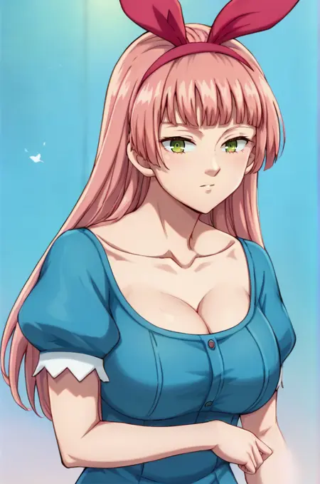 isolde1, pink hair, green eyes, blunt bangs, long hair, black eyes, large breasts, red hairband, blue dress, short sleeves, cleavage, brown belt, pink thigh-highs, gloves,