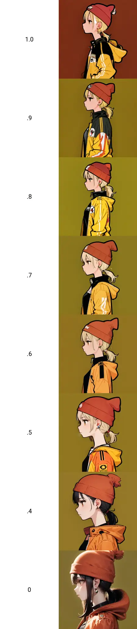 생성 결과는 AOM3에서 테스트를 바탕으로 선정되었습니다. 다른 체크포인트를 사용할 때는 가중치를 실험해 보는 것을 추천합니다.