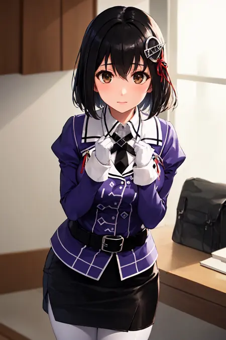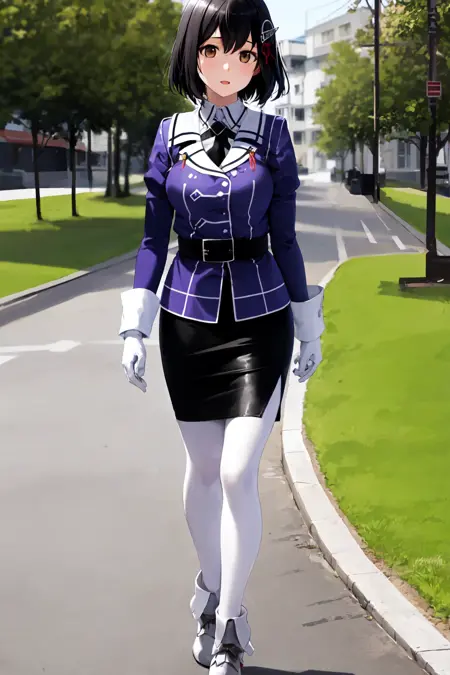 복장: 군복, 보라색 재킷, 검은 넥타이, 흰 장갑, 검은 벨트, 검은 치마, 미니 스커트, 펜실 스커트, 흰 팬티스타킹, 회색 신발, 하이힐,