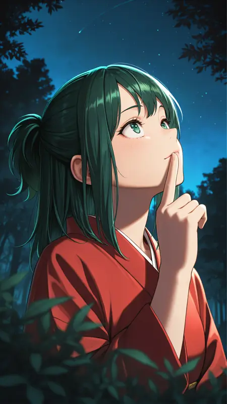green hair, short ponytail, green eyes, pink sweater, blue skirt, pencil skirt, apron