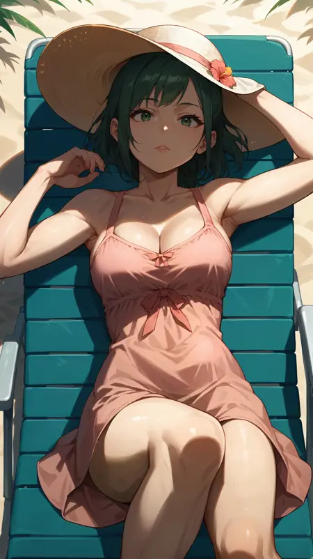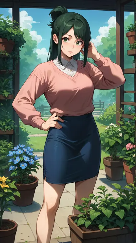 green hair, short ponytail, green eyes, pink sweater, blue skirt, pencil skirt, apron