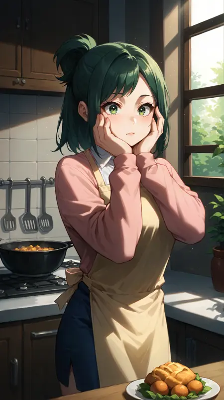 green hair, short ponytail, green eyes, pink sweater, blue skirt, pencil skirt, apron,