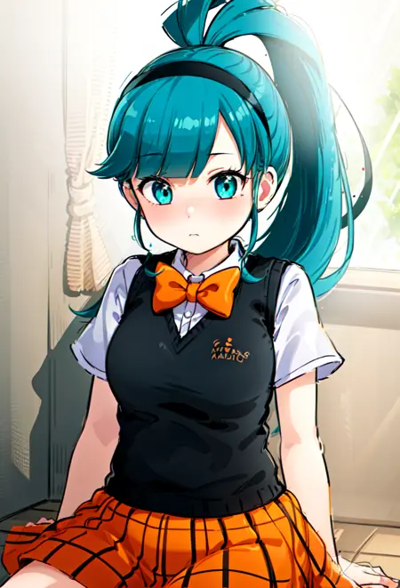옷 2: 검은색 스웨터 조끼, 헤어밴드, 주황색 치마, 주황색 리본