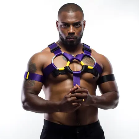 Harness를 착용한 남자의 이미지를 생성하세요. 다양한 색상도 시도해보세요.