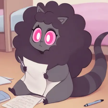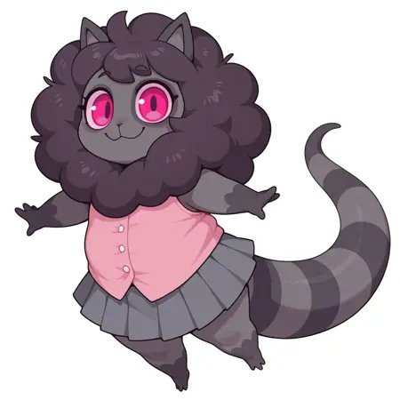 Possum, Cat, hybrid, female furry, round body, shortstack, cat ears, gray and black fur, puffy mane, striped tail, thick tail, pink eyes, small hands, small feet,