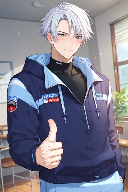 Normal: blue jacket, black turtleneck, zipper, drawstring, blue sweatpants, sneakers