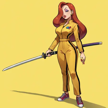 オプション:刀、剣を手持ち、黄色のジャンプスーツ、スニーカー