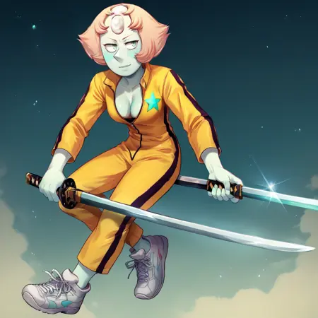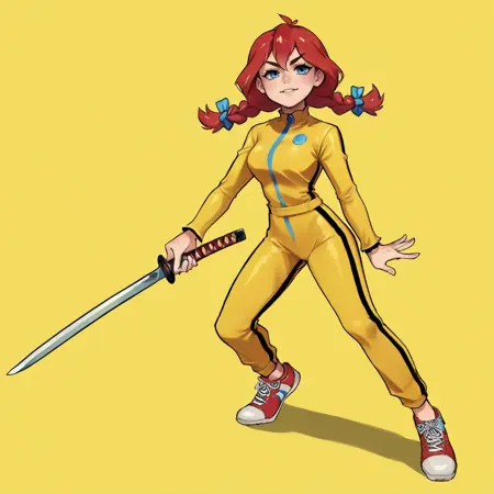 katana, holding sword, yellow jumpsuit, sneakers