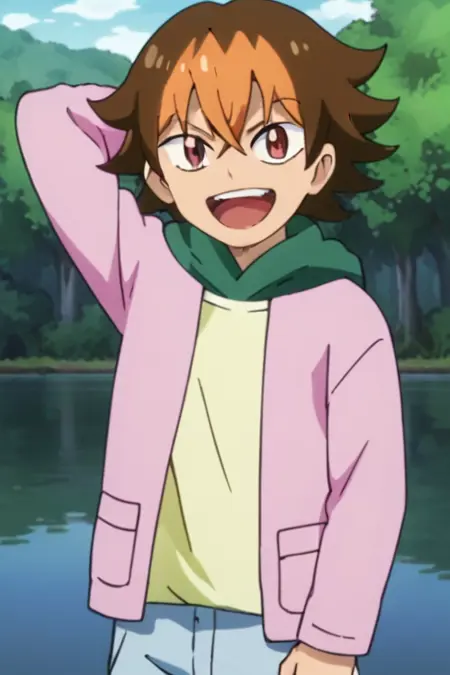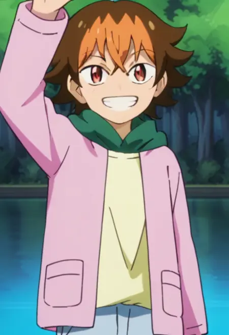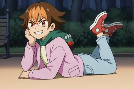 Prompts: male, multicolored hair, two-tone hair, brown hair, orange bangs, pink sweatshirt, light yellow shirt, green hood, red eyes, light blue pants, red shoes, deck box around left leg, outdoors (park)