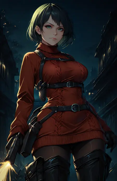 外見タグ: ブロンドヘア、ショートヘア、緑の目、赤いスカーフ、オレンジのジャケット、オレンジのセーター、緑のスカート、チェック柄スカート、黒いパンティーストッキング、茶色の靴、膝丈ブーツ