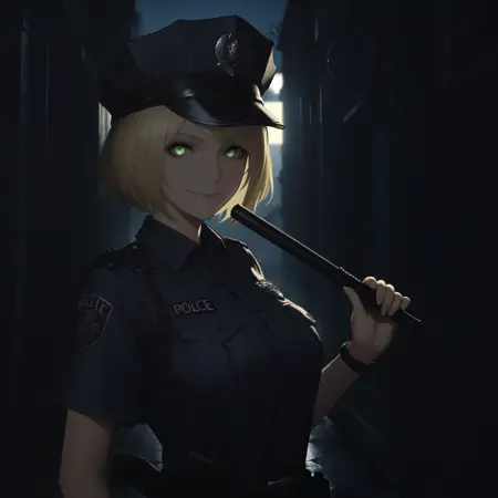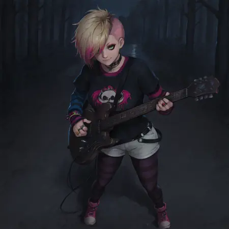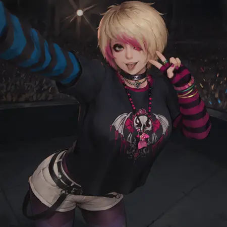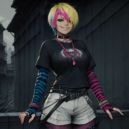 外見タグ: 多色ヘア、ブロンドヘア、ショートヘア、ピンクヘア、緑の目、アイライナー、片方の目に髪をかけたスタイル、黒いカラー、ネックレス、黒いシャツ、ストライプの袖、不一致の袖、青い袖、ピンクの袖、指なし手袋、ストライプ手袋、ブレスレット、指輪、黒いベルト、複数のベルト、白いショートパンツ、紫のパンティーストッキング、ショートパンツの下のパンティーストッキング