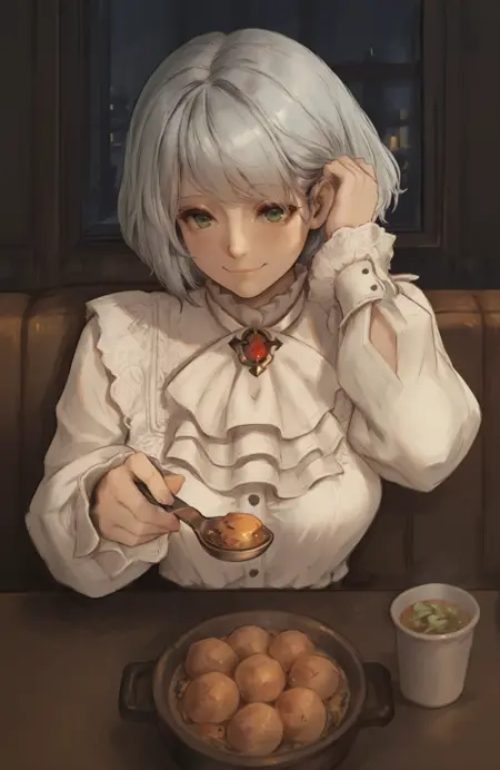 外見タグ: ショートヘア、白い髪、緑の目、白いアスコット、白いシャツ、赤い胸元のジュエリー、黒いズボン