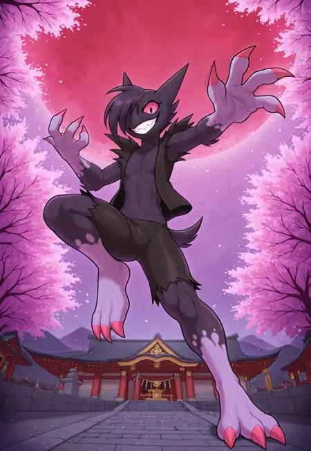 포니 태그: 로피드된, score_9, source_furry, 솔로, 풀 바디, 1소년, 컬러링된 피부, 컬러링된 공막, 한쪽 눈에 긴 머리카락, 웃는 표정, 손가락이 적음, 갈고리, 꼬리, 포켓몬(생물)