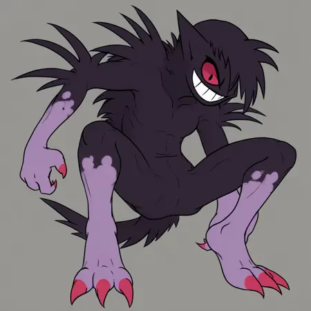 Illustrious tags: lopied, solo, full body, 1boy, colored skin, purple skin, colored sclera, hair over one eye, grin, fewer digits, claws, tail, pokemon (creature), furry