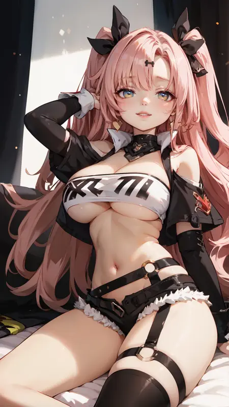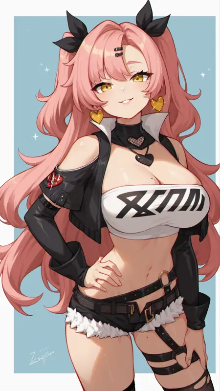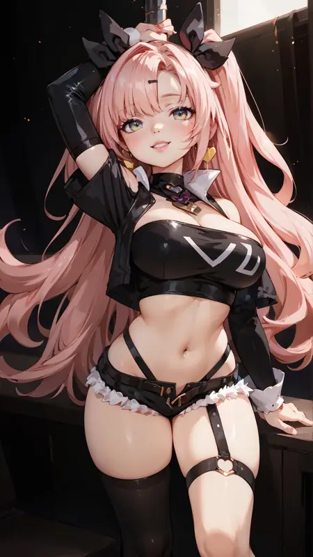 示例提示:"nicole_demara, 一个动漫女孩, 1girl, 单人, 长发, 胸部, 看着观众, 微笑, 张嘴, 刘海, 大胸, 简单背景, 头饰, 过膝袜, 长袖, 白色背景, 蝴蝶结, 肚脐, 珠宝, 极长发, 绿眼睛, 站立, 夹克, 全身, 头发蝴蝶结, 粉色头发, :d, 大腿, 耳环, 靴子, 衣物敞开, 短裤, 袜子, 发夹, 露脐, 腰带, 黑色过膝袜, 腹部, 黑色鞋履, 雀斑, 夹克敞开, 两侧头发向上, 黑色夹克, 露脐上衣, 眼下雀斑, 无肩带, 黑色蝴蝶结, 黑色短裤, 黑色袜子, 单侧过膝袜, 胸部雀斑, 管状上衣, 短裤, 超短裤, 大腿雀斑"