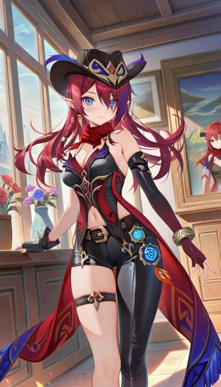 服:へそ、赤いスカーフ、中程度の胸、ブレスレット、帽子、不対称な下着、ベルト、胸元、肘まで手袋、裸の肩、不対称な手袋、手袋、フィンガーレス手袋、ハイヒール、