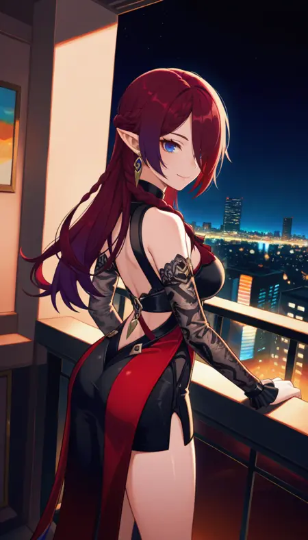タグ:tj_chasca、とがった耳、長い髪、複色の髪、赤髪、紫色の髪、青い目、片方の目に髪をかけている、編み込み、イヤリング、ジュエリー、
