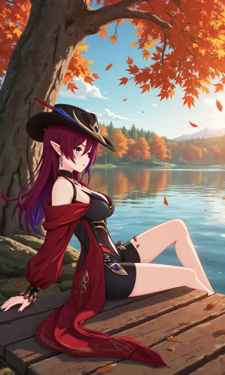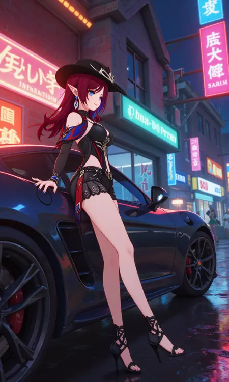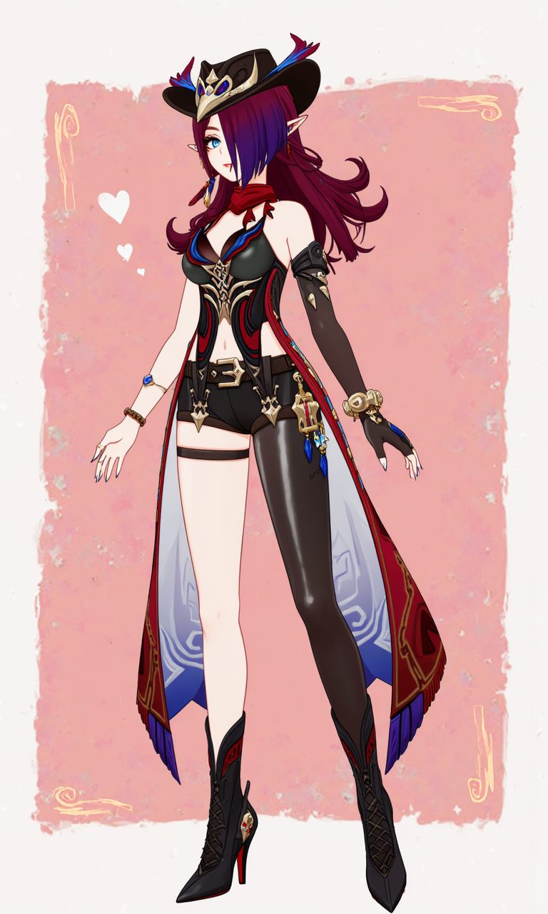 옷: 배꼽, 빨간 스카프, 중간 크기의 가슴, 팔찌, 모자, 비대칭 하의, 벨트, 가슴 돌출, 팔꿈치 장갑, 어깨 노출, 비대칭 장갑, 장갑, 손가락 없는 장갑, 하이힐,