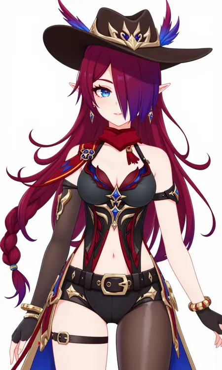 태그: tj_chasca, 뾰족한 귀, 긴 머리, 다색 머리, 빨간 머리, 보라색 머리, 파란 눈, 한쪽 눈을 가린 머리, 땋은 머리, 귀걸이, 보석,