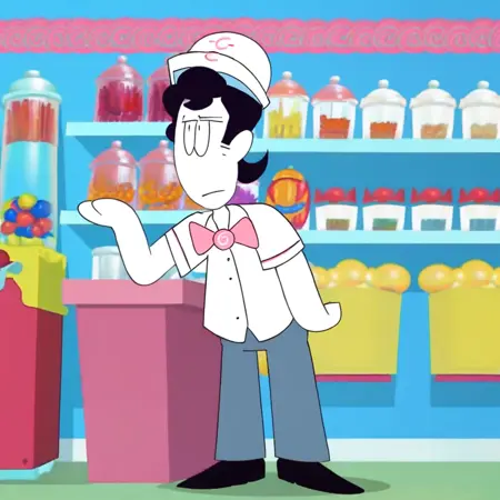Kevin_Spooky_Month, Black hair, black eyes, white skin, white shirt, buttons, single pink line on both sleeves, short sleeves, pink bowtie, white employee cap, light blue pants, black shoes, 1boy, solo