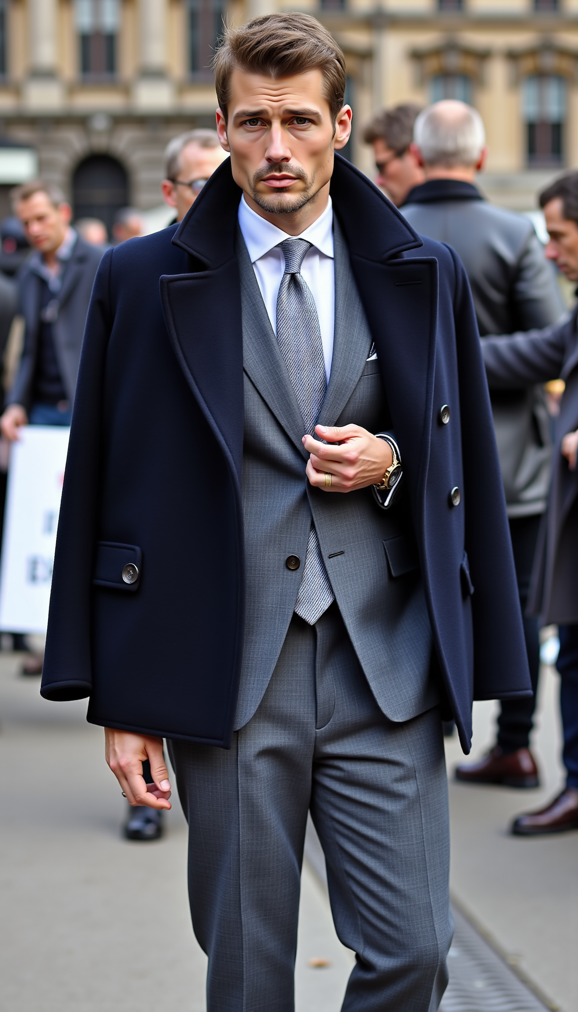穿着一件披在肩上而不将手臂穿入袖子的外套。