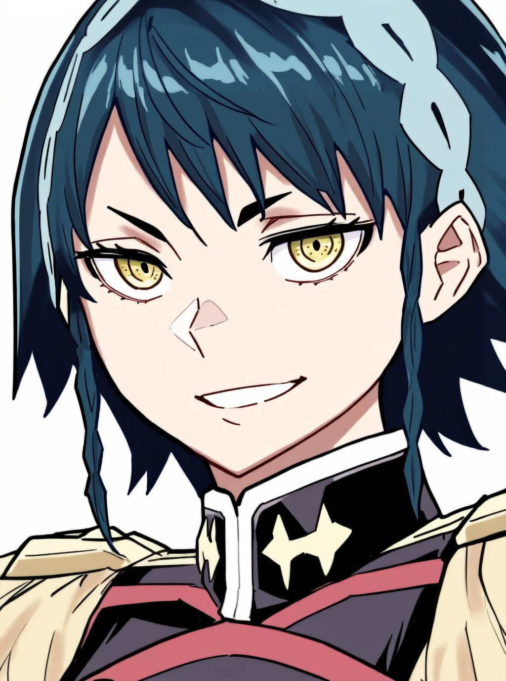트리거: azuma_tobera, tobera_uniform, 1girl, solo, 파란 머리, 치마, 부츠, 땋은 머리, 팔 교차, 흰 배경, 보는 시선, 전체 몸, 노란 눈, 벨트, 검은 신발, 검은 치마, 유니폼,