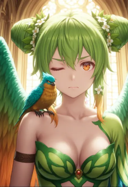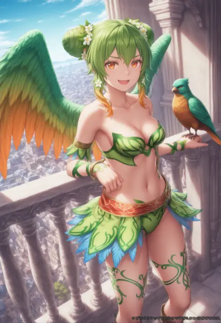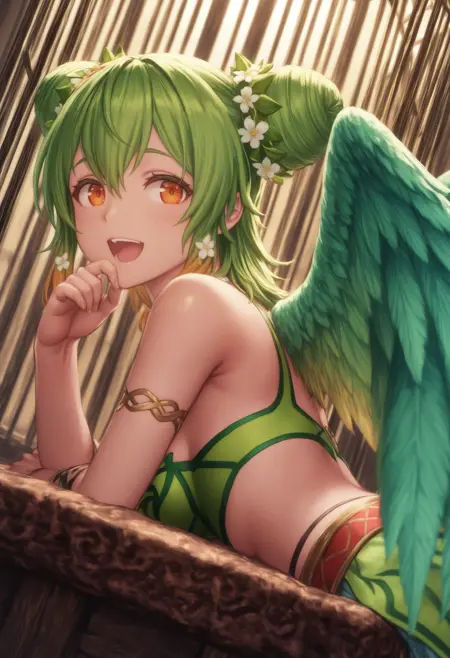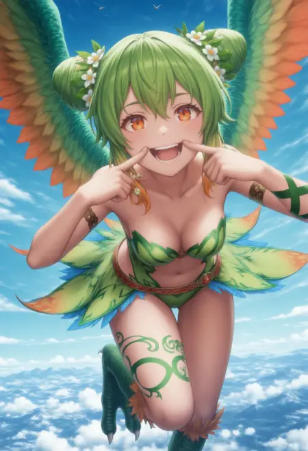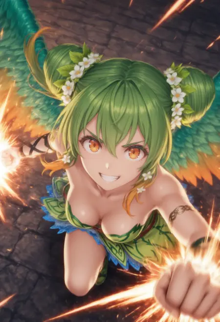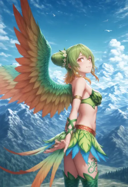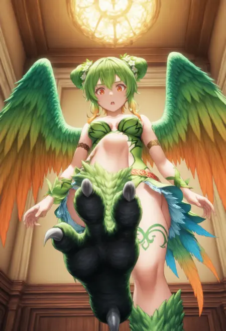 트리거 단어만으로도 충분히 캐릭터를 재현할 수 있지만, 윈디를 생성할 때는 녹색 머리카락, 더블 번, 헤어 장신구, 깃털 날개, 머리꽃, 다채로운 날개, 주황색 눈, 새 다리, 문신, 몬스터 소녀 등에서 원하는 요소를 추가해 주세요. 클라우디아나 스카야 등의 다른 장신구나 색상이 다른 버전을 원하실 경우, 해당 색상을 명시해 주세요.