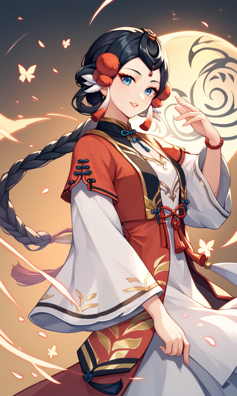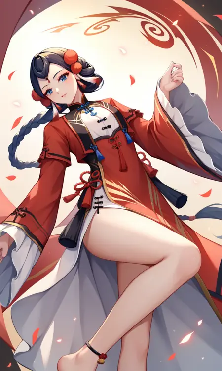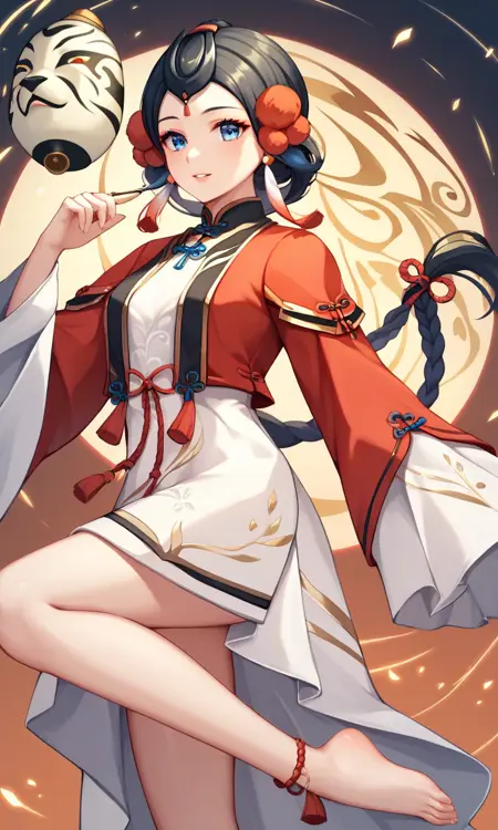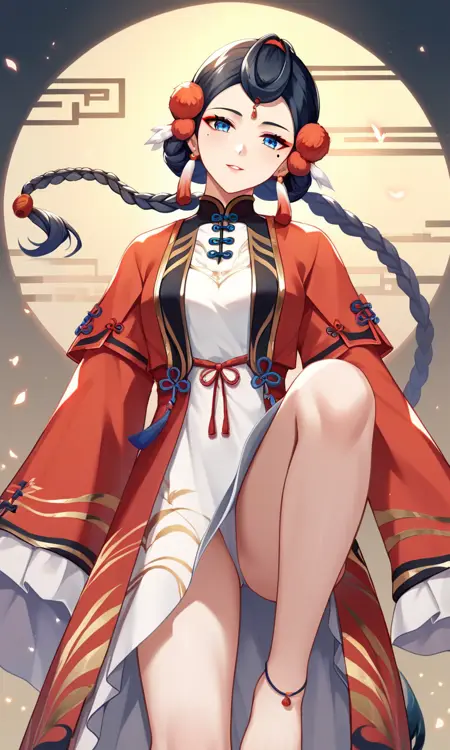 Menreiki, black hair, single braid, extremely long braid, hair ornament, makeup, blue eyes, chinese clothes, white inner dress, red outerwear, wide sleeve, sleeve past finger, bare legs, bare feet, bell anklet, dual red moles, red mole under each eye