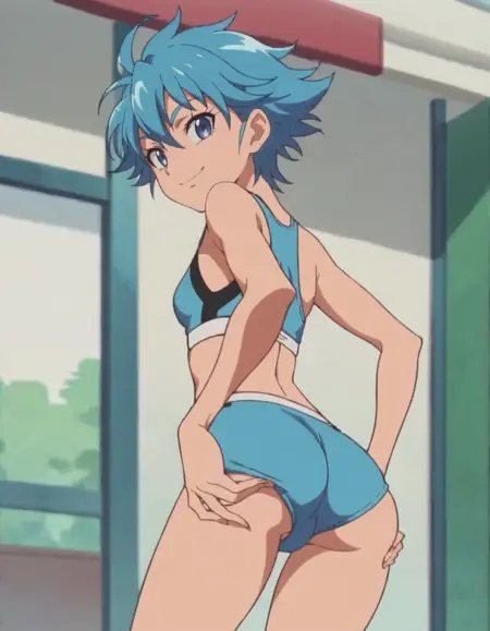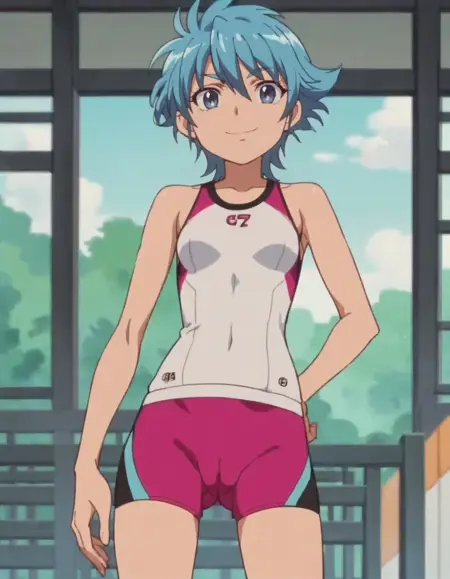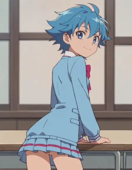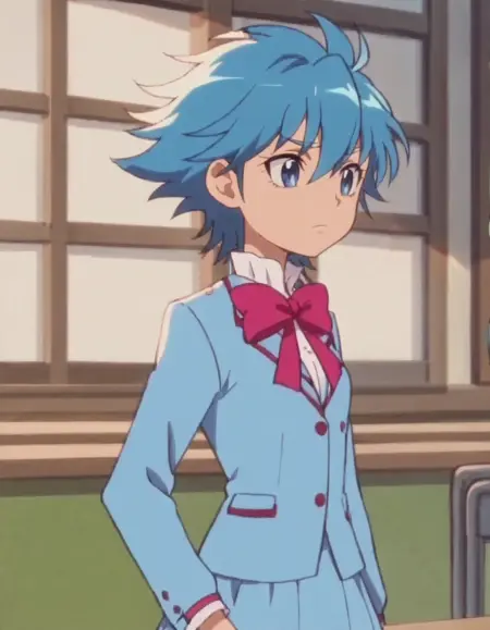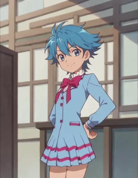 score_9, score_8_up, score_7_up, anime screencap, solo, 1girl, nishijimawaon, 学校制服, 青い髪, 青い目, 青いシャツ, スカート, ピンクのリボン, 長袖, lora:nishijimawaon:0.8