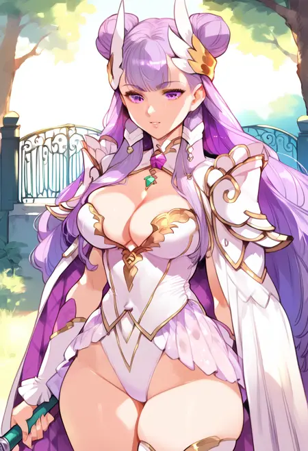 Trigger: palamena, purple hair female, long hair, double bun, breasts, purple eyes, cleavage, white leotard, hair ornament