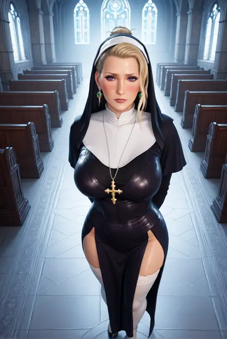 ScarletFF7R, short hair, hair bun, purple eyes, blonde hair, mature female, bare shoulders, earrings, red dress, side slit, makeup, black thighhighs, high heels