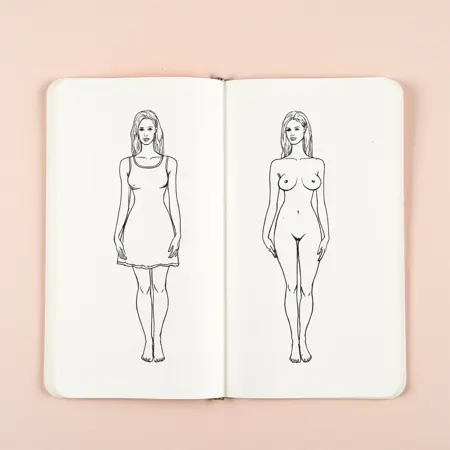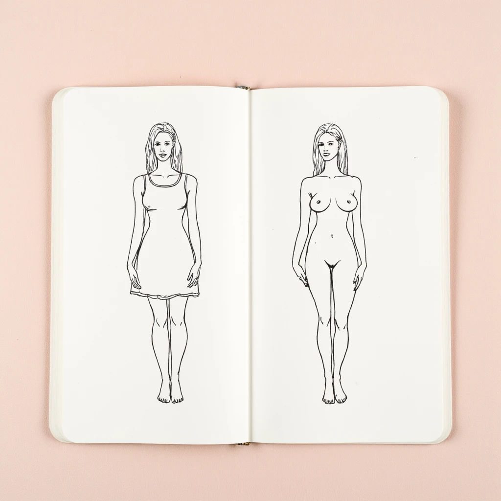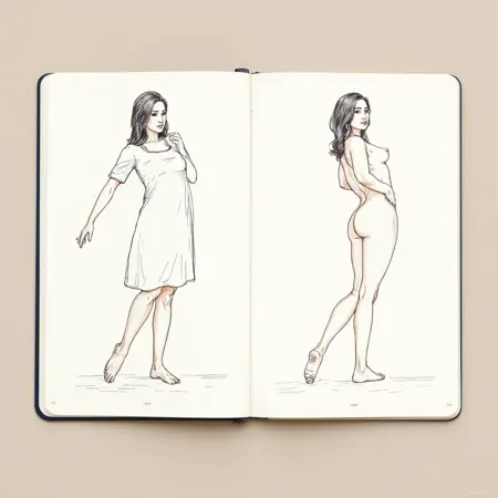 プロンプトの最初にこの文を使用してください:Two images clothed and naked of a woman, [衣装と背景の詳細を続けて記述]