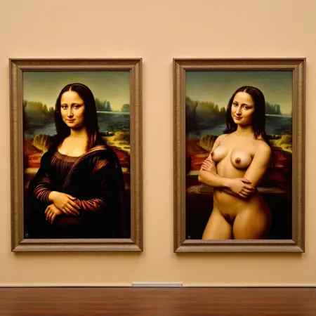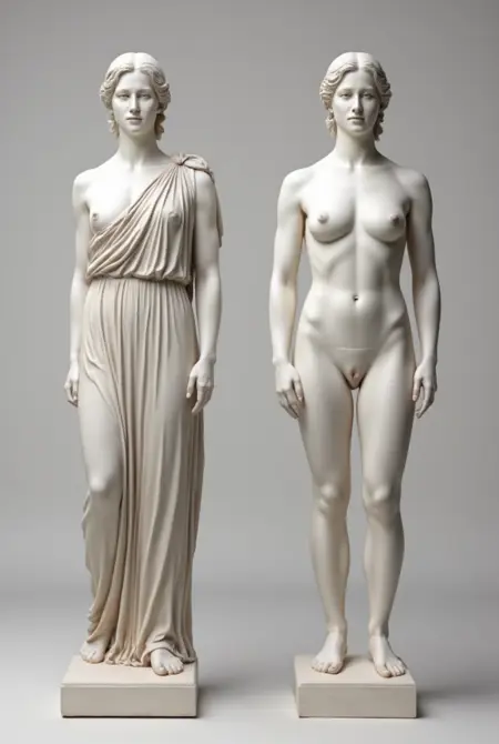 例:Two images clothed and naked of a woman, queen, sitting on throne, royal silk dress, jewellery, crown
