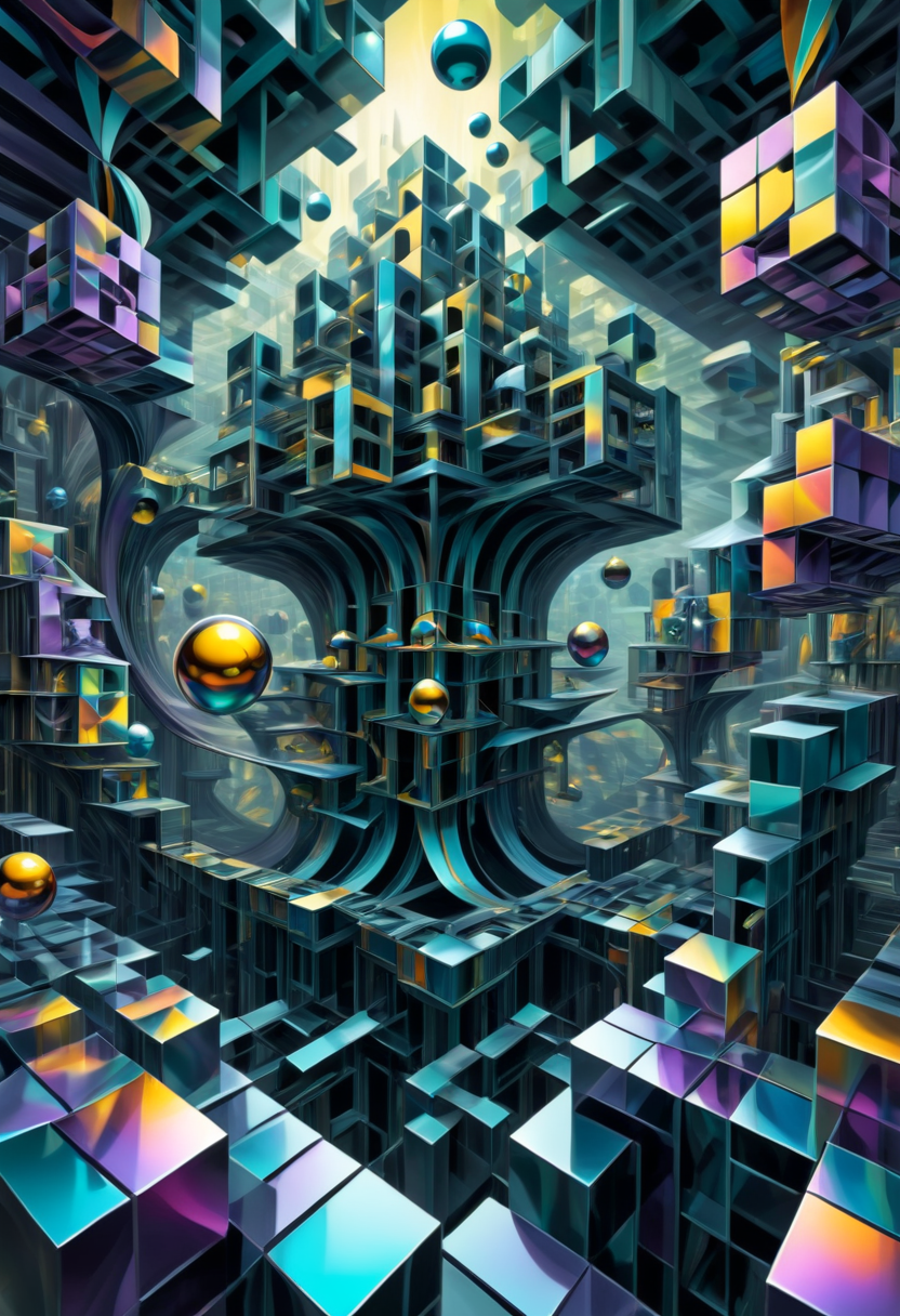 由尖锐塔楼与漂浮球体构成的几何梦境:抽象而迷人,创造出仿佛有生命的异世界。