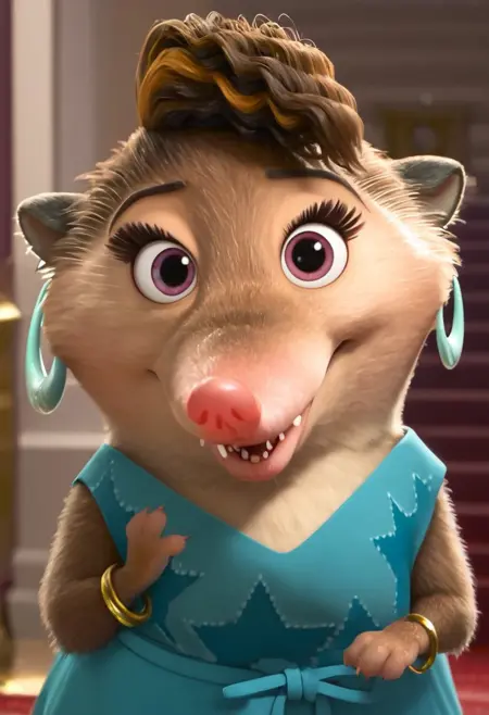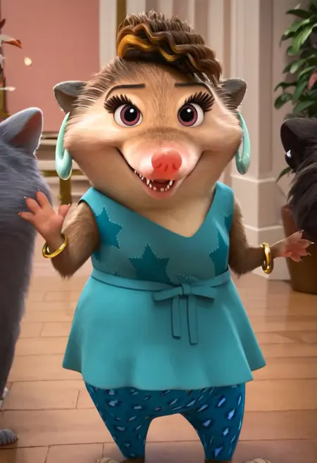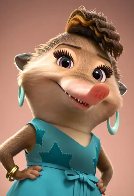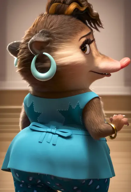 christine_z+casual, furry, anthro, female arctic shrew, short curly brown hair (one golden hair streak), tan golden-brown fur, long pink nose, big eyelashes, golden-brown eyes, golden-brown hands (four fingers), short claws, brown-gray feet, brown tail, light blue dress (darker blue star patterns), light blue ribbon around the waist, dark blue pants (cheetah patterns), teal-colored earrings (hoop rings), gold bracelet on right arm,