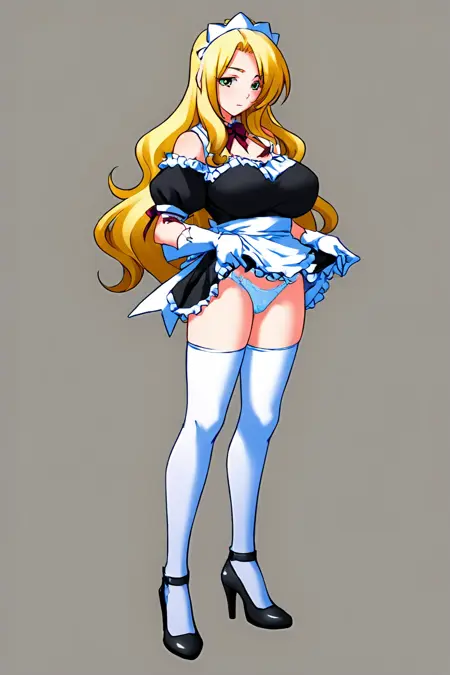 메이드: 메이드, 메이드 헤어 액세서리, 장갑, 어깨 노출, 팬티, 신발, 에프론, 하이힐, 흰색 허벅지 스타킹