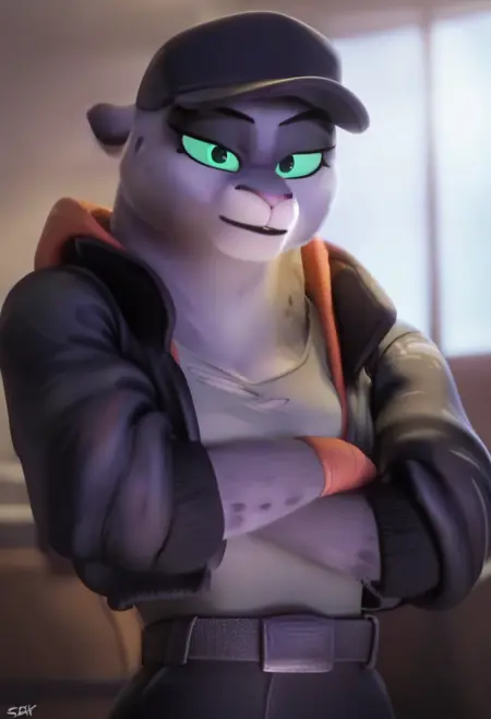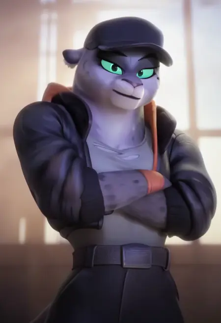 주요 프롬프트: 키티 캣, 스노우 레오파드, 회색 털, 꼬리, 녹색 눈