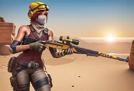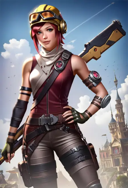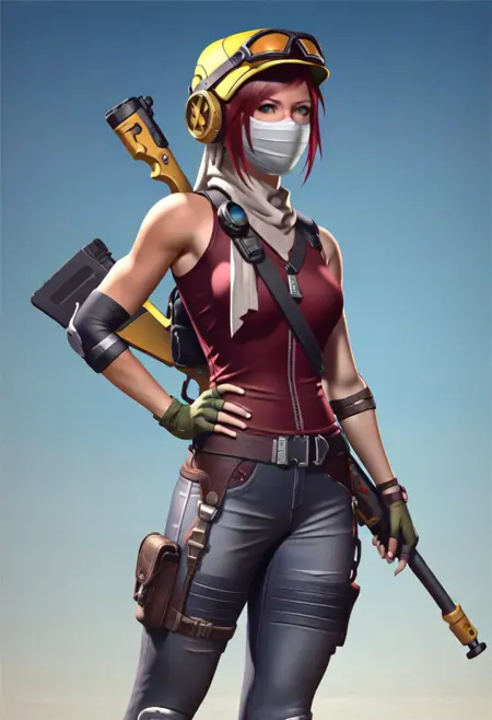 완전한 옷차림을 원할 경우: 헬멧 위에 안경, 헬멧, 붉은색 머리카락, 손가락이 없는 장갑, 팔꿈치 패드, 짧은 머리, 어깨 노출, 빨간 셔츠,