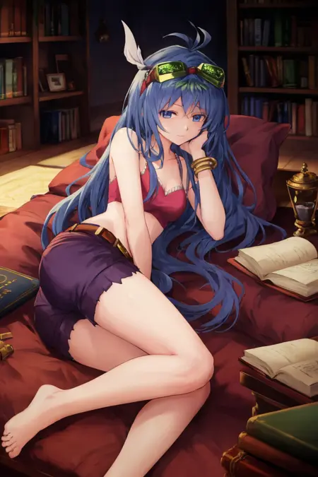 slacker_ygo, 보석, 누워 있음, 허리, 반바지, 맨발, 벨트, 팔찌, 베개, 책, 옆으로 눕힘, 고글, 머리에 고글, 머리 받침, 책장