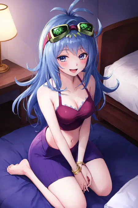 slacker_ygo, 얼굴 붉음, 벌어진 입, 치마, 보석, 맨발, 허리, 팔찌, 안테나 머리카락, 고글, 소파, 머리에 고글, 실내, 침대, 침실, 정좌, 위에서 내려다보기, 시청자 보기, 미소, 손은 무릎 위에 올려둠