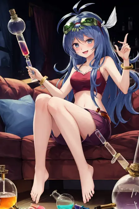 slacker_ygo, 얼굴 붉음, 미소, 벌어진 입, 치마, 보석, 앉아 있음, 맨발, 허리, 팔찌, 안테나 머리카락, 고글, 소파, 머리에 고글, 시험관, 플라스크, 둥근 바닥 플라스크