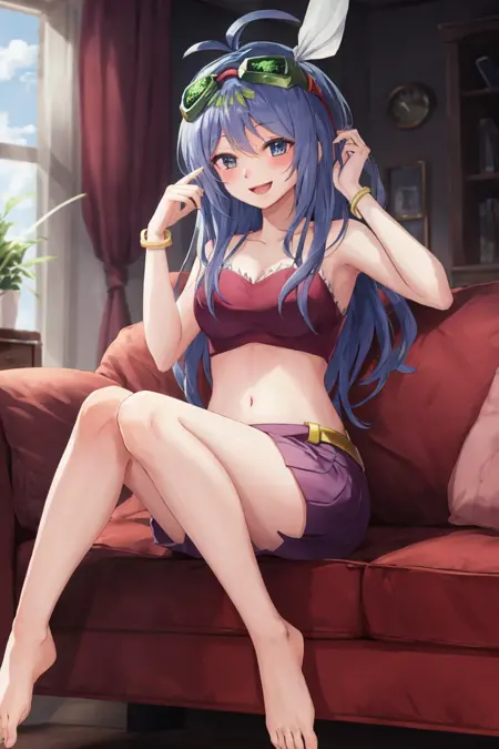 slacker_ygo, 얼굴 붉음, 미소, 벌어진 입, 치마, 보석, 앉아 있음, 맨발, 허리, 팔찌, 안테나 머리카락, 고글, 소파, 머리에 고글